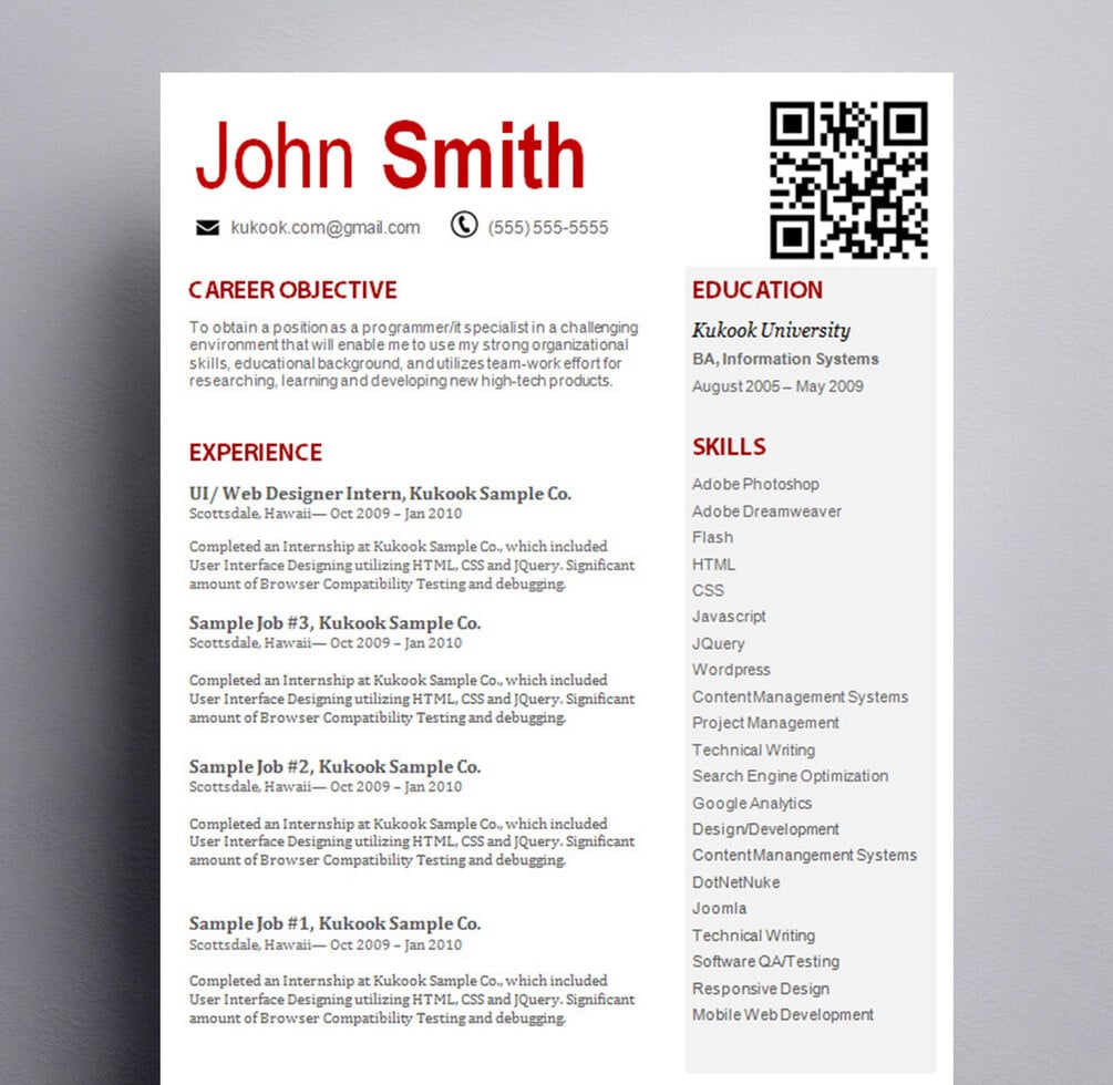 This resume template provides a modern twist to an entry level position resume. The purpose of this template is to showcase the employment and experience along with noteworthy skills. The QR-code gives the resume a cool twist!